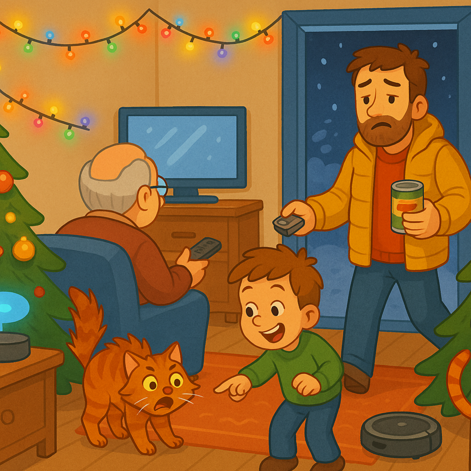 Балалар маркетплейстан бая килгән гирлянданы сүтә һәм кабыза. Мәче исә, бу гамәлләрне күреп, үзен бәйрәмнең төп кунагы дип саный һәм чыршы астына кереп утыра. Акыллы йорт системасы шундук яңа җиһазны “күрә” һәм үзенә тоташтыра, утларны музыка ритмына ярашлы җемелдәтә.